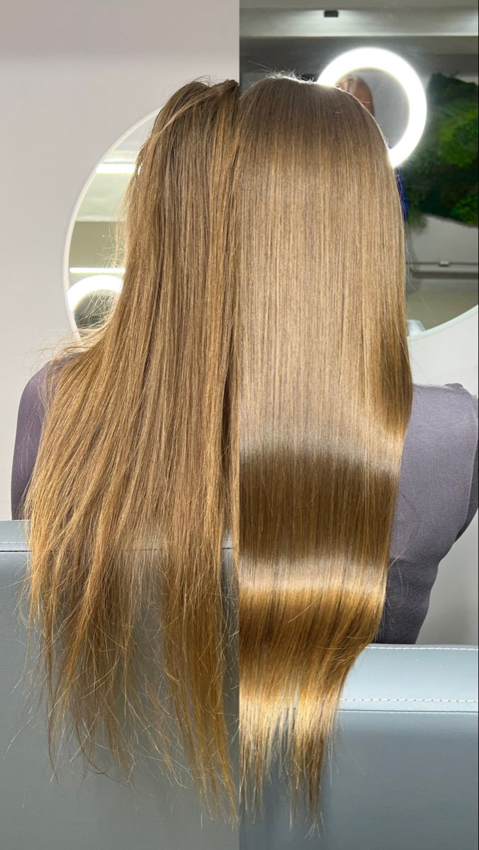 Результат — м’яке, шовковисте волосся з дзеркальним блиском без обтяження.